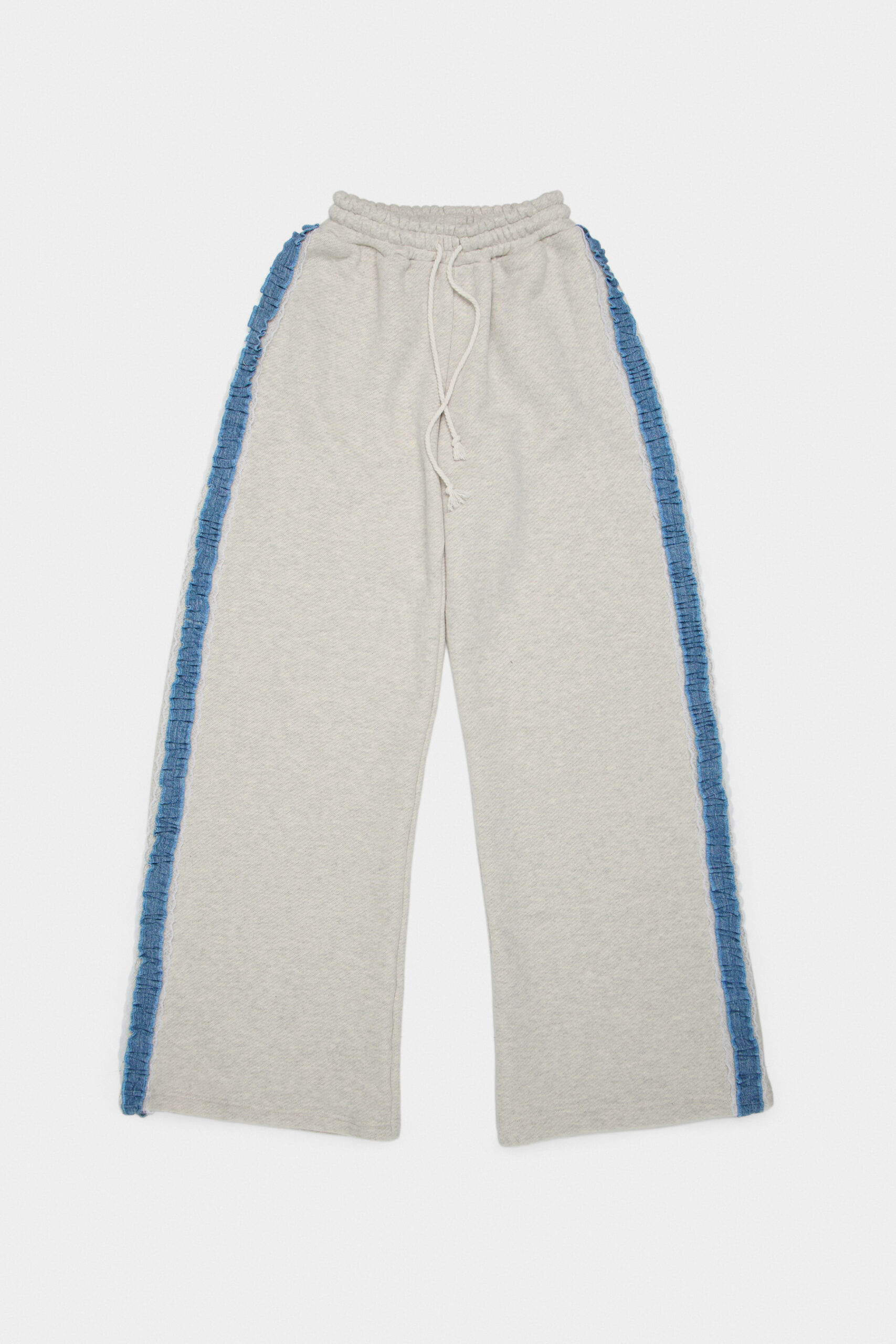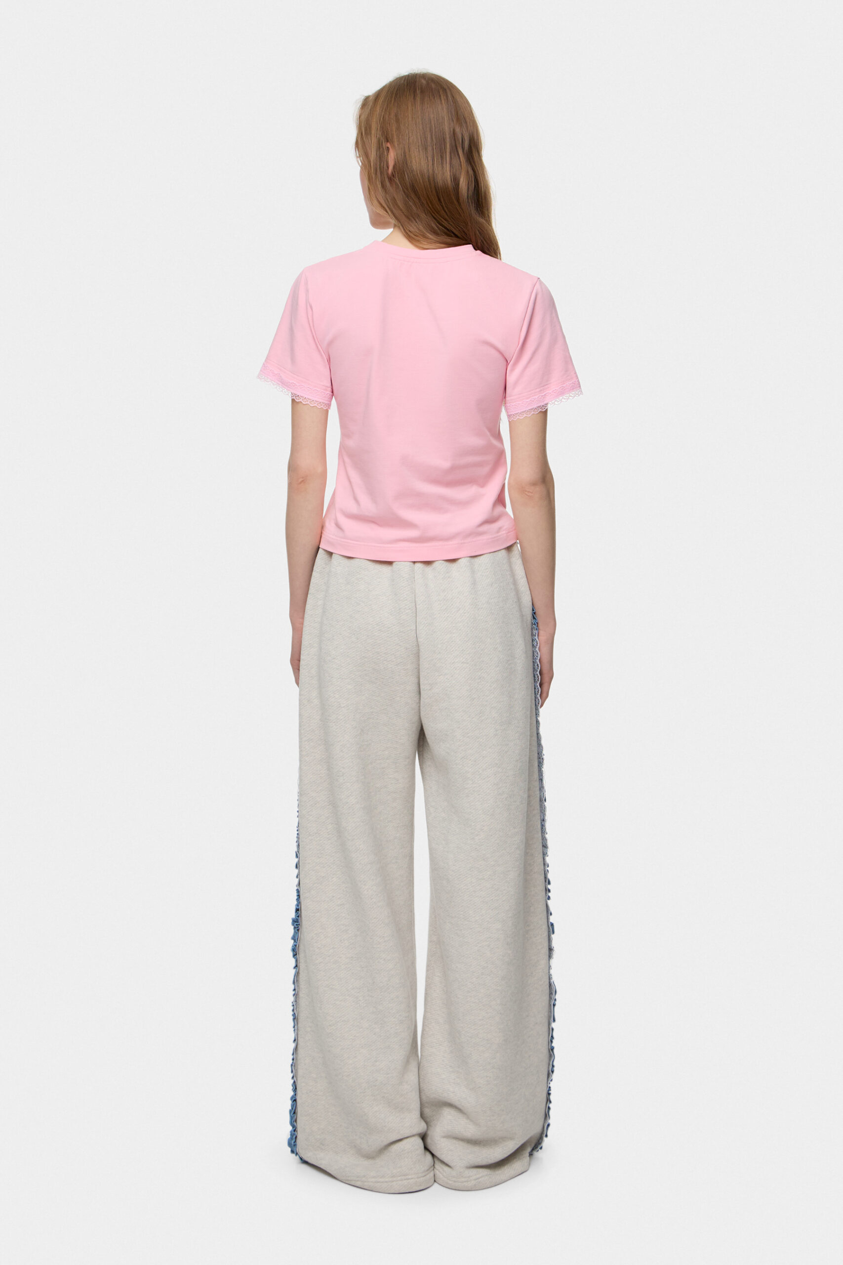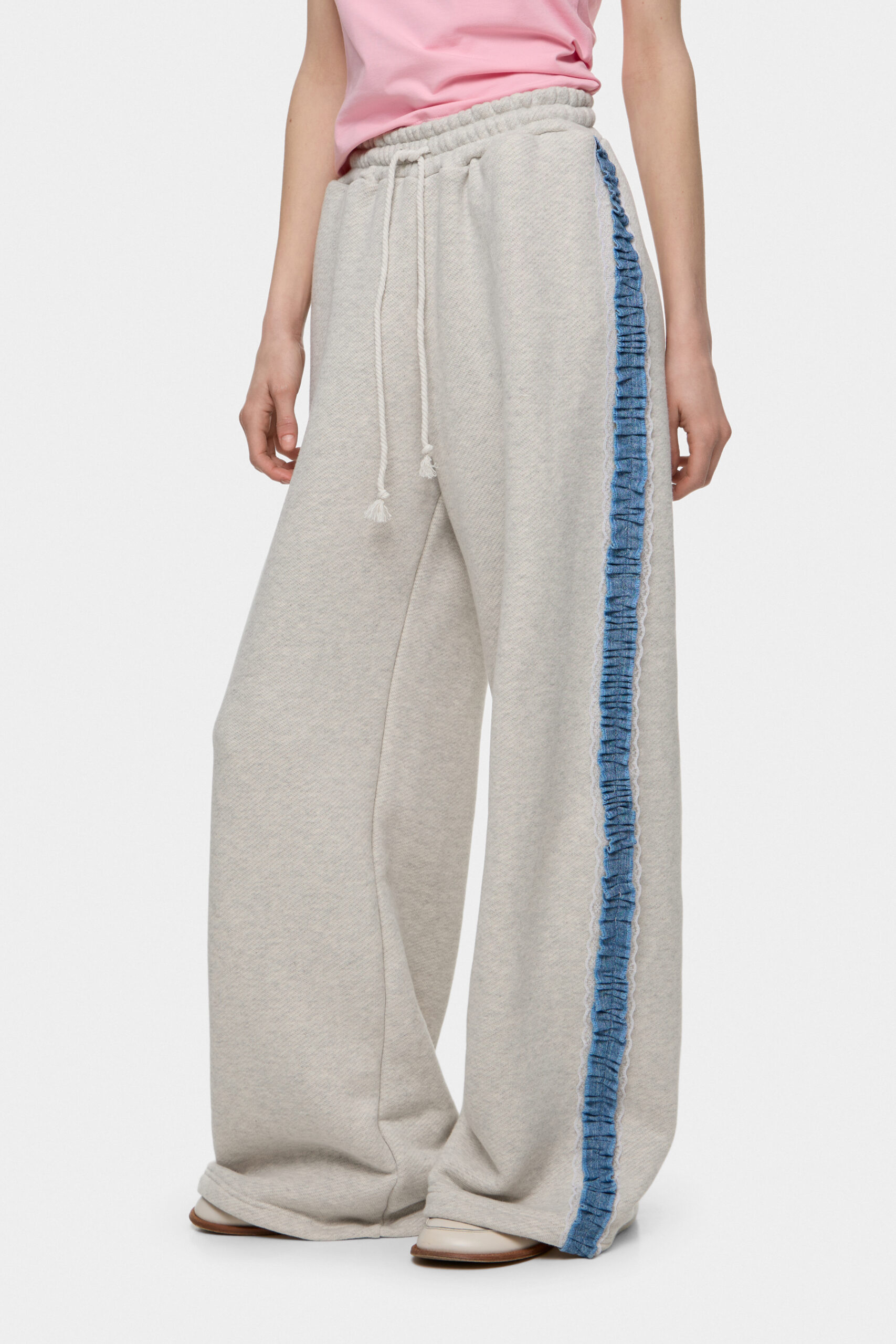 Штани з посадкою, яка дозволяє носити їх як на середній, так і на високій талії. Бокові шви декоративно оздоблені елементами з деніму та мережива, додаючи фактурності та виразного акценту в образі.