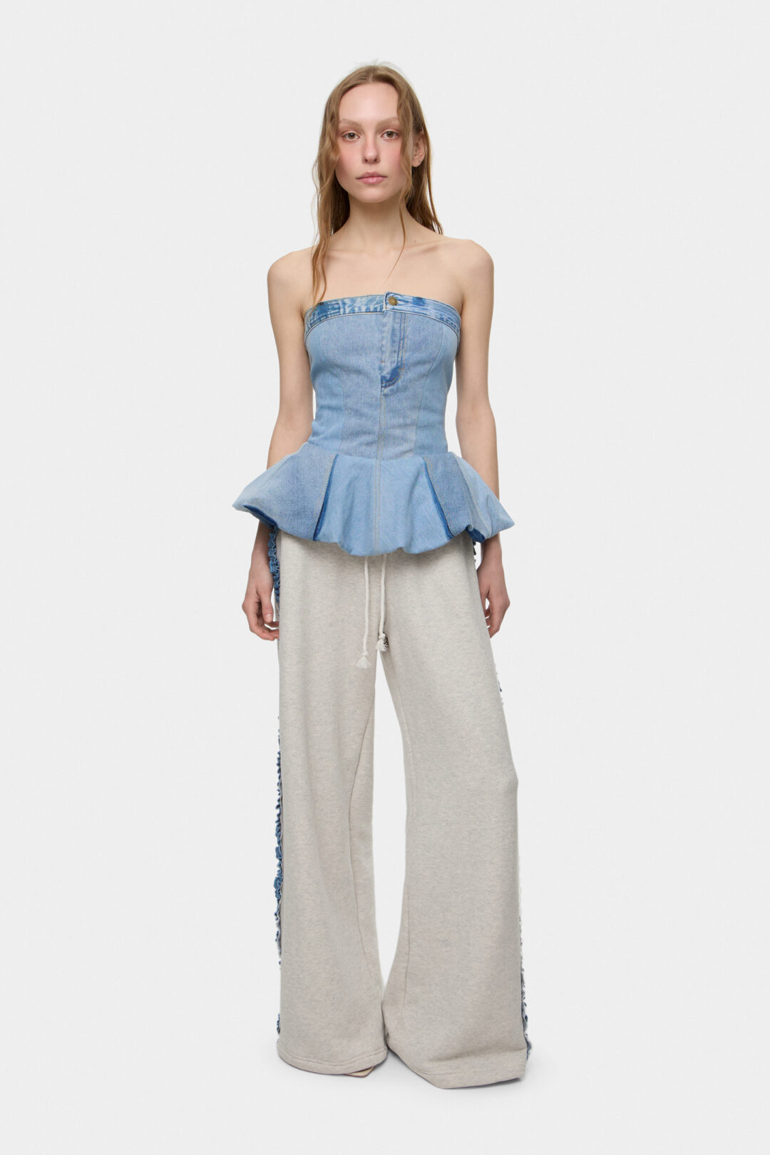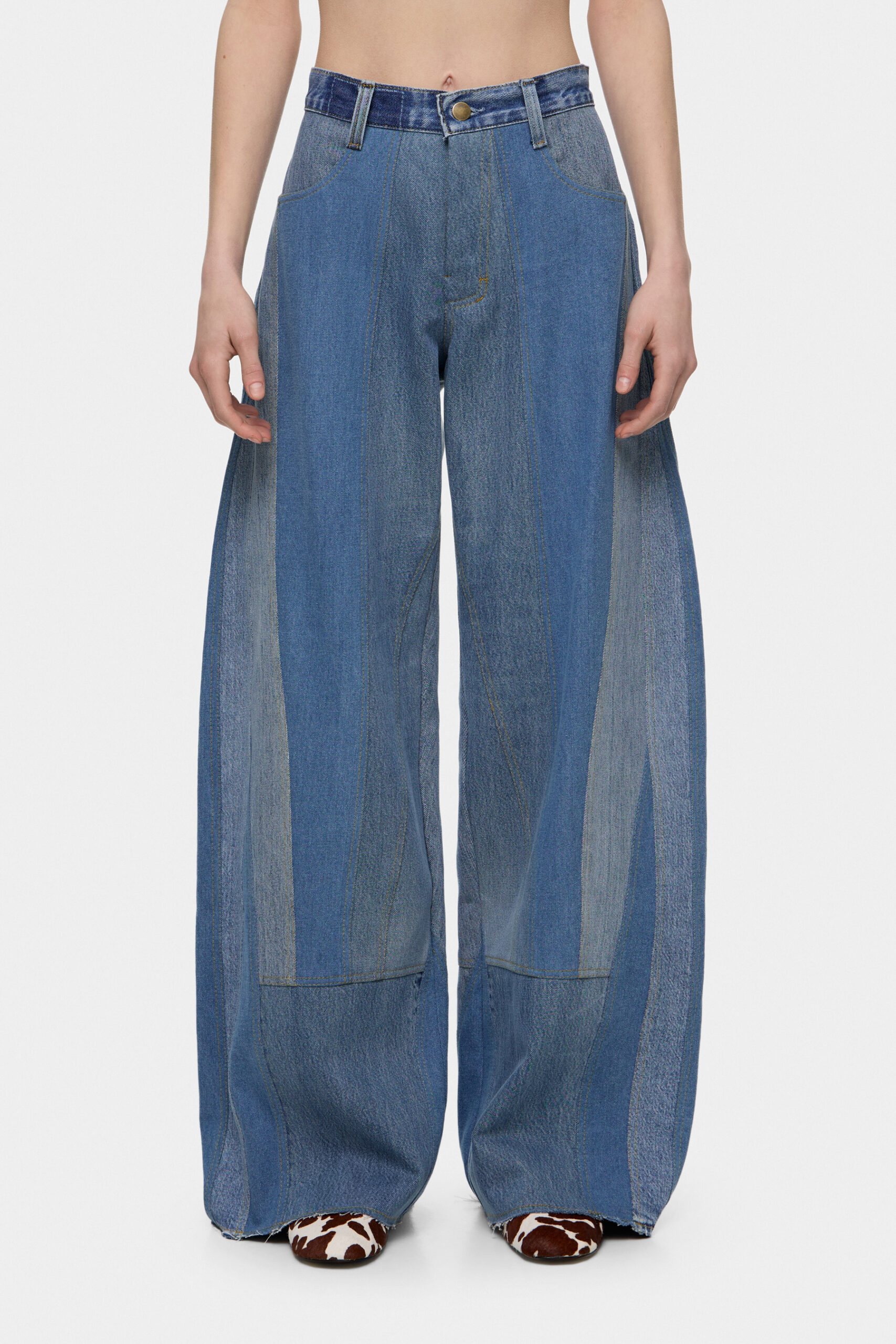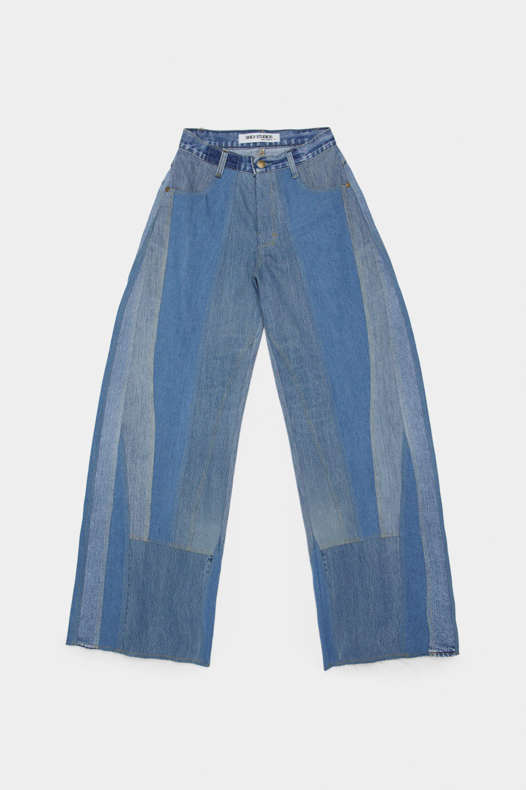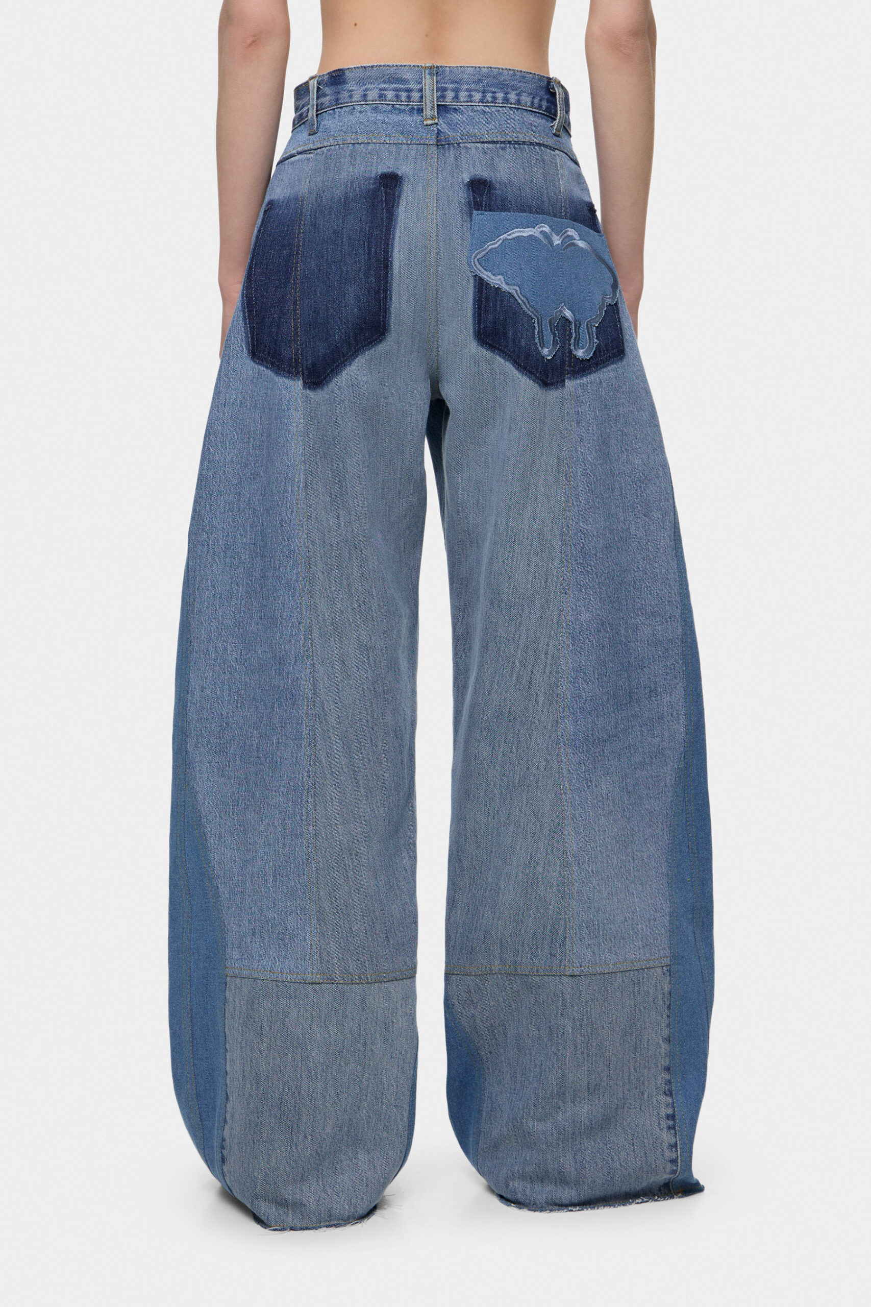 Джинси середньої посадки, створені з поєднання різних денім-клаптиків, натхнених формою крила метелика. Складна композиція матеріалів формує виразний, багатошаровий візерунок, що робить кожну пару унікальною та неповторною. Відтінок деніму може злегка відрізнятися, так як виріб створений технікою апсайклінг.