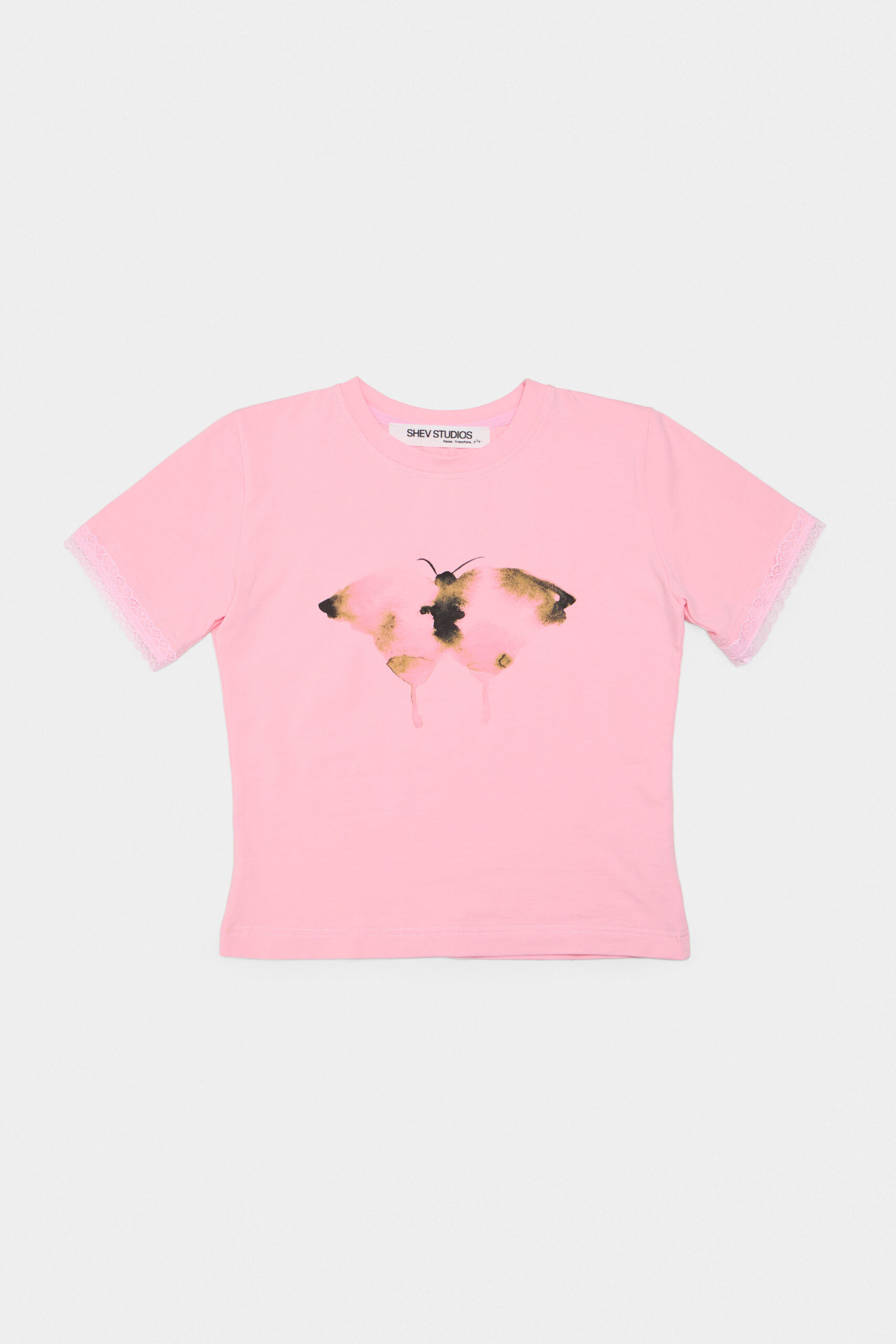 Футболка slim fit, що підкреслює силует і створює витончений образ. Акцентний принт метелика спереду додає виробу характеру та символізує трансформацію, а мереживо на рукавах надає образу ніжності й делікатної виразності.