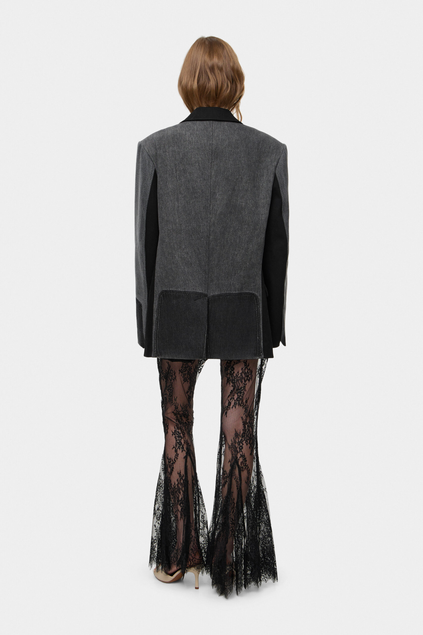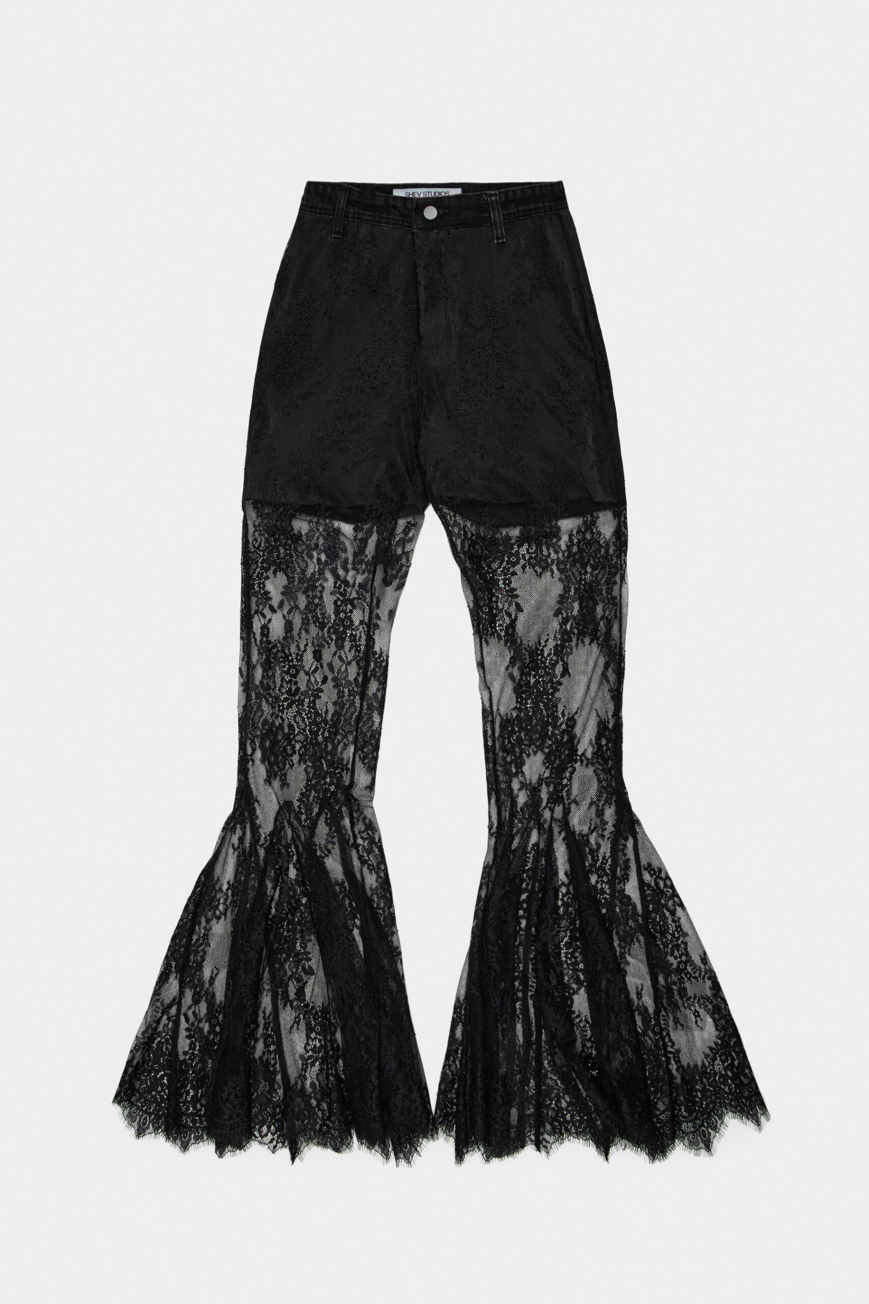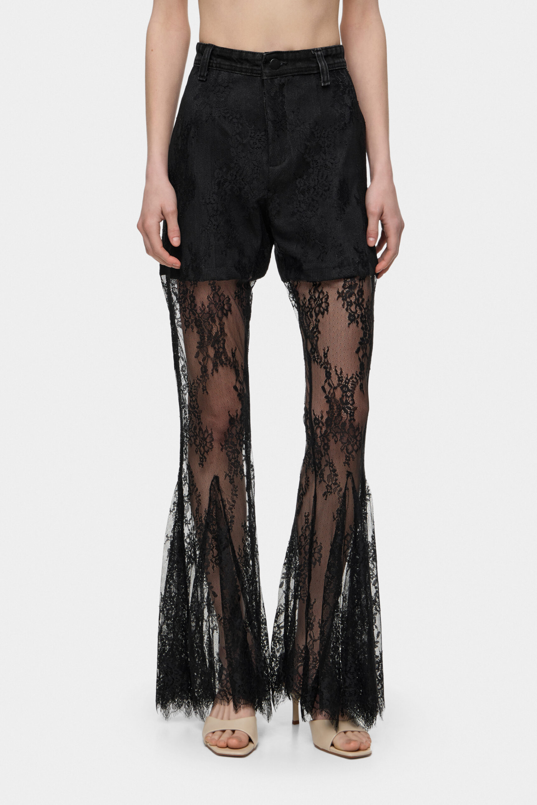 Штани з мережива кльош на високій посадці, що візуально подовжують силует і підкреслюють талію. Легкі та виразні, додають образу жіночності й делікатної фактурності. Родзинка моделі вбудовані шортики з переробленого деніму.
